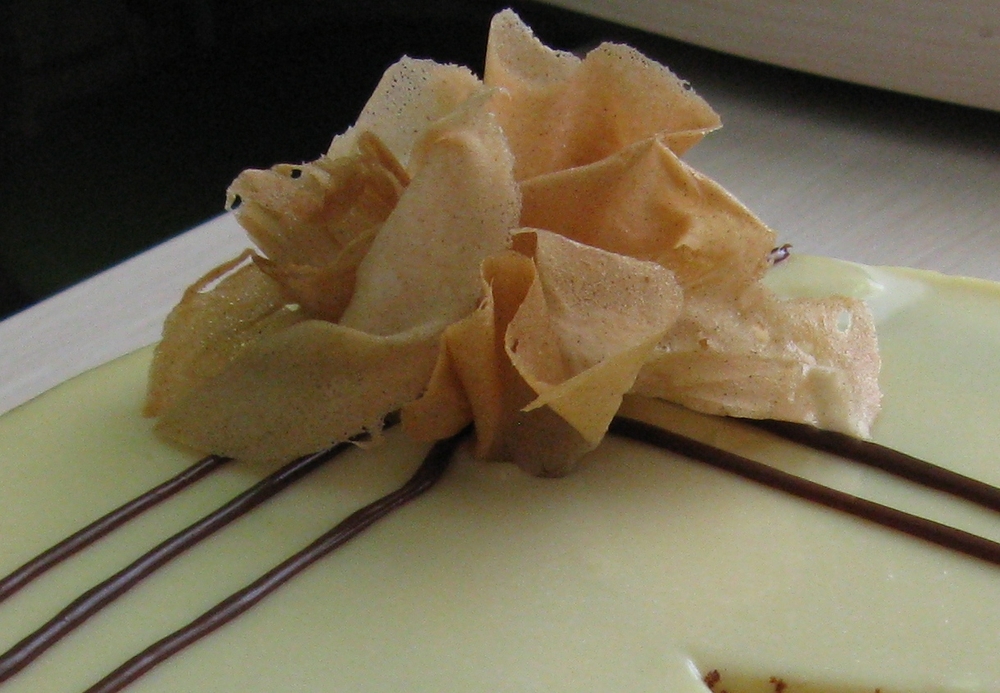 На силиконовый лист для выпечки широкой кисточкой из теста нарисовать тоненькие круги шириной 7-8см. Пусть даже в этих кругах будут незамазанные пробелы, так будет даже ажурней. Выпекать при 180 около минуты до кремового цвета.