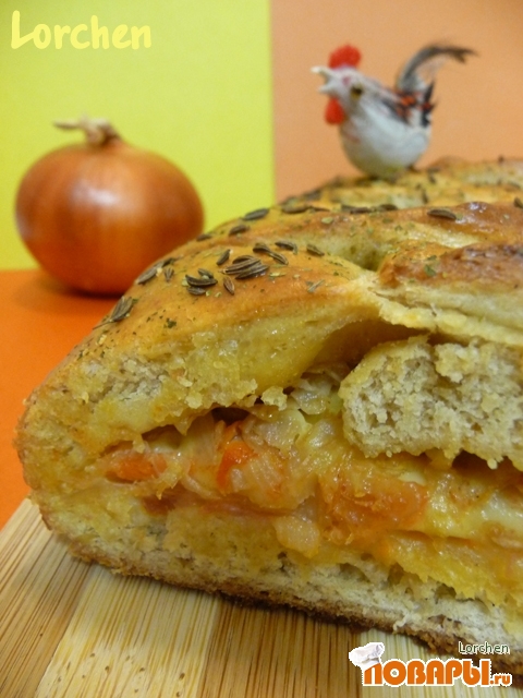 Белок слегка взбить, смазать кисточкой хлеб и посыпать тмином и петрушкой.