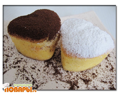 Формочки для выпекания, у меня были силиконовые сердечки, смазать сливочным маслом. Бисквит поднимается высоко, поэтому заполняем формочки на 1/3 тестом. Выпечка 30 мин. Во время выпечки не открывайте духовку, выпекать на среднем огне. Проверить готовность зубочисткой.