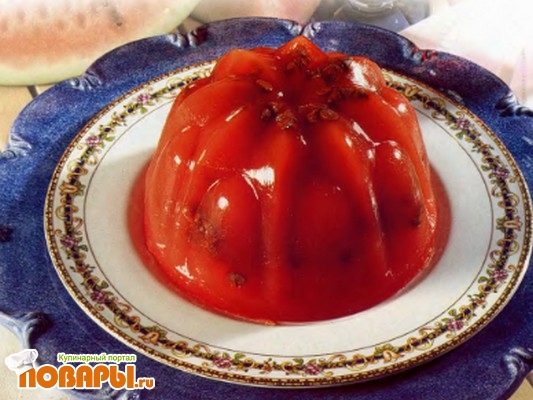 Положите желатин в кастрюльку, разбавьте небольшим количеством арбузного сока, добавьте остальной сок и перемешайте. Поставьте кастрюльку на слабый огонь, доведите до кипения и варите 4 мин, помешивая, пока смесь слегка не загустеет.
