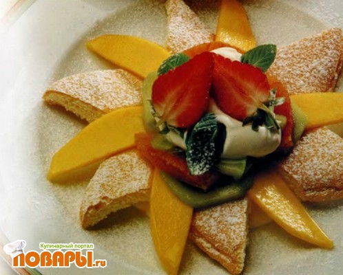 Выложите слоями крем и кусочки киви с дольками апельсина, начиная и заканчивая кремовым слоем. Украсьте их ломтиками клубники и листиками мяты. Посыпьте сахарной пудрой, пропуская ее через сито.
