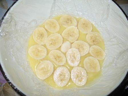 Форму или миску (у меня - миска) застелить пищевой пленкой, оставив свисать края. На дно выложить немного крема. Сверху уложить слой порезанного кружочками банана.