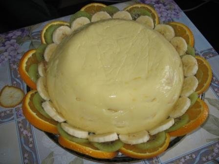 Бананы нарезать кружочками, апельсин и киви - полукольцами. Выложить вокруг десерта сначала бананы, затем киви и апельсин в виде лепестков.