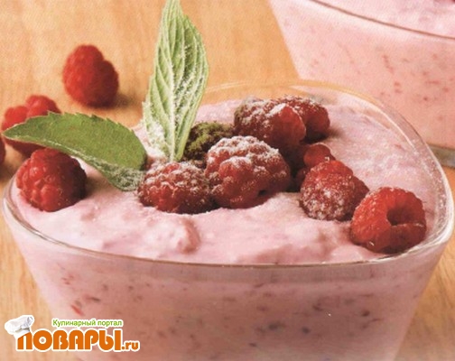 Творог взбейте миксером до кремообразной консистенции, добавьте сметану, сахар и взбивайте еще минуту. Положите малину и взбивайте все вместе еще 30-50 секунд. При подаче оформите ягодами.