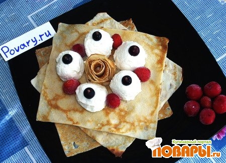 Теперь собираем весь десерт «Квадро» воедино: на тарелку укладываем квадратные блины, в середину ставим розочку из краёв блинчика, окружаем розу творожными шариками и украшаем все свежими ягодами.