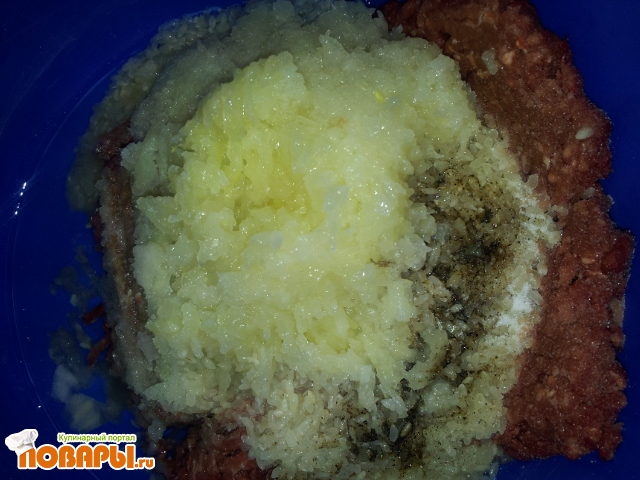 Тем временем готовим начинку - в говяжий фарш добавляем натёртый на мелкой тёрке лук, соль, перец, промытый рис, подсолнечное масло.