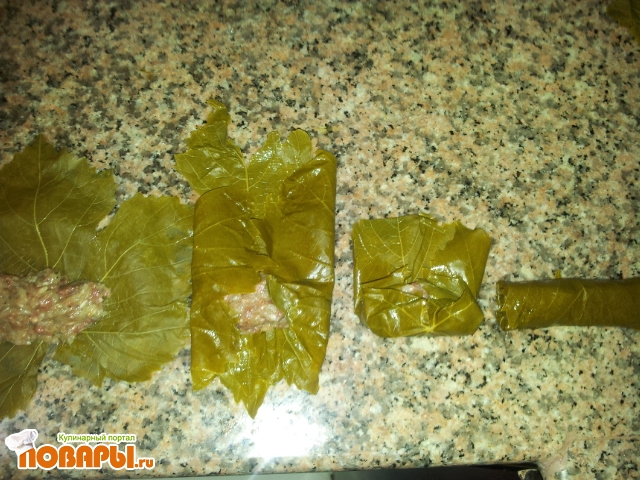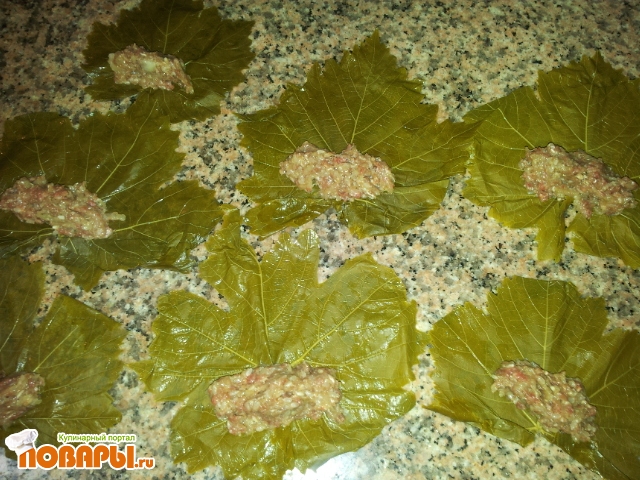 Укладываем в широкую кастрюлю, предварительно на дно постелив пару листочков, чтоб не пригорело. Наливаем воды столько, чтоб только еле прикрывала долма.