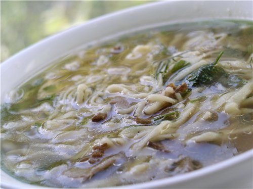 Грибы замочить, из курятины сварить бульон, мясо вынуть, сварить в этой воде грибы. Замесить из яйца, соли и муки крутое тесто, нарезать на кусочки, каждый кусочек очень тонко раскатывать и нарезать на тонкую лапшу.