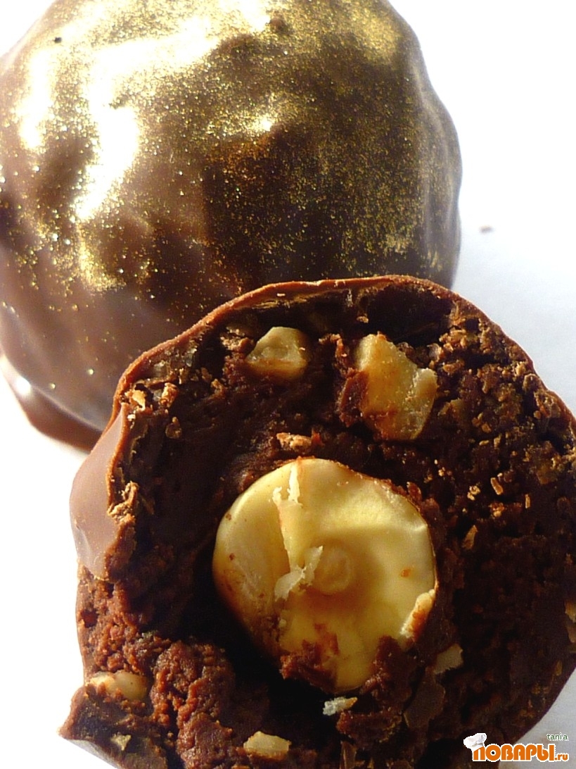 Отложить штук 35 целый орешков, остальные очень меленько нарубить ножом, высыпать в глубокую тарелку. Руками выделывать шарики, вдавливать в серединку по орешку, обкатать их в нарубленном фундуке.