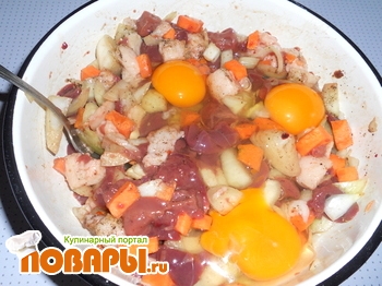 Печень и сало порезать небольшими кусочками. Морковь и лук - кубиками. Добавить яйца и приправы, поперчить и посолить по вкусу.