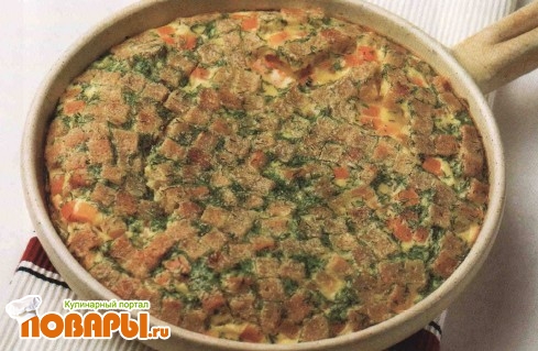 На смазанную маслом сковороду вылейте взбитую массу, запеките при 170 °С до образования румяной корочки и сразу подайте, так как масса быстро оседает.