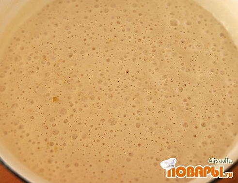 Где-то через час можно уже жарить. Тесто не размешивать! Набираем половником снизу и выливаем на раскаленную сковородку, по желанию можно её смазать маслом.