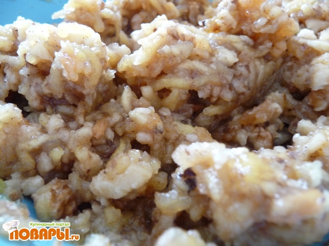 Начинка: яблоки очистить от кожуры и семян, натереть на крупной терке, смешать с сахаром, корицей и мёдом. Потушить на сковороде 5 минут. Когда остынет, добавить орехи, перемешать.