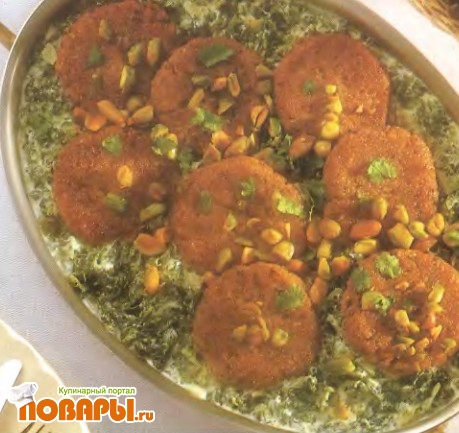 Фалафель - гороховая котлетка со специями - блюдо, распространенное на Ближнем Востоке. В нашем рецепте к традиционному набору ингредиентов добавляют булгур, яйцо и хлебные крошки. Фисташковые орешки, которыми посыпаны фалафели, делают кушанье слегка хрустящим и неожиданным, поскольку запечены они в мягком шпинате с йогуртом.