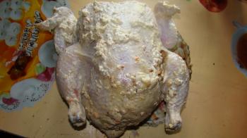 Для начала, если курица замороженная, нужно её разморозить и вымочить. Затем нужно смешать майонез, чеснок и специи. Замочить в нём курицу и оставить на ночь.