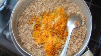 Промойте гречку, затем залейте водой и варите до готовности. На сковороде обжарьте лук и морковку. Высыпьте морковь и лук в гречку, и тщательно перемешайте.