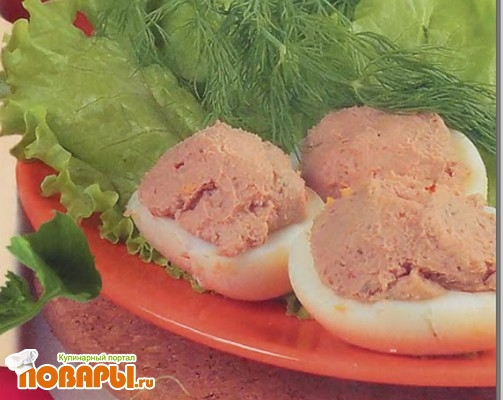 Заполнить получившимся паштетом половинки яиц и уложить их срезом вверх на блюдо, покрытое листьями салата. Полить майонезом пли густой сметаной.