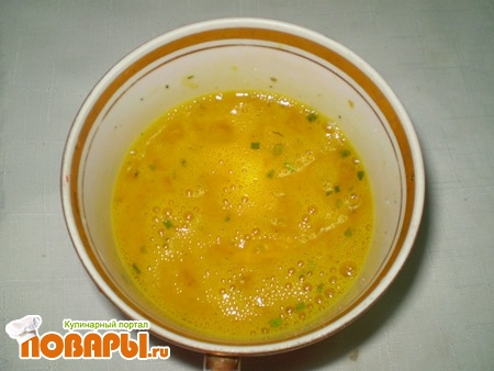 Взбить пять яиц, посолить, поперчить.