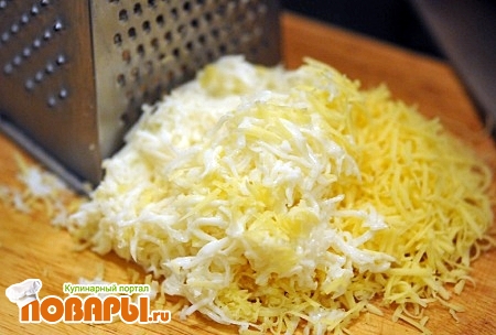 Яйца отварить. Белок отделить от желтка. Белок растереть на мелкой терке. Сыр растереть на мелкой терке.