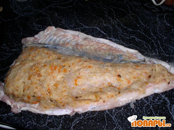 Рыбу, почистить, обрезать плавники и хвость и снять аккуратно шкуру. Отделить от костей мясо и перемолоть в мясорубке вместе с луком, морковкой и салом.