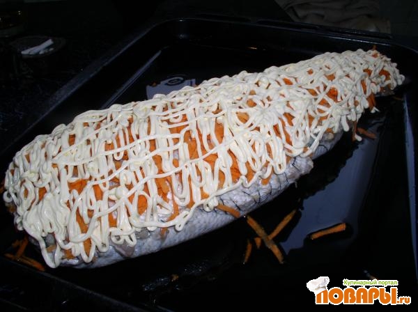 Выложить нашу рыбку на смазанный маслом противень, посыпать сверху морковкой (потереть на крупную терку)и полить немного майонезом.