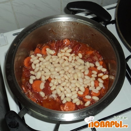Фасоль для приготовления по этому рецепту можно брать и свежую, но тогда ее нужно замачивать в воде на 3-5 часов. Если берете консервированную, то не в томатном соусе.