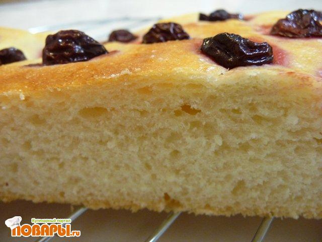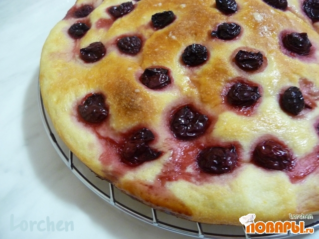 Вишню посыпать 1 ложкой сахарной пудры. Уложить вишню равномерно на фокаччу и немного вдавить их вовнутрь.