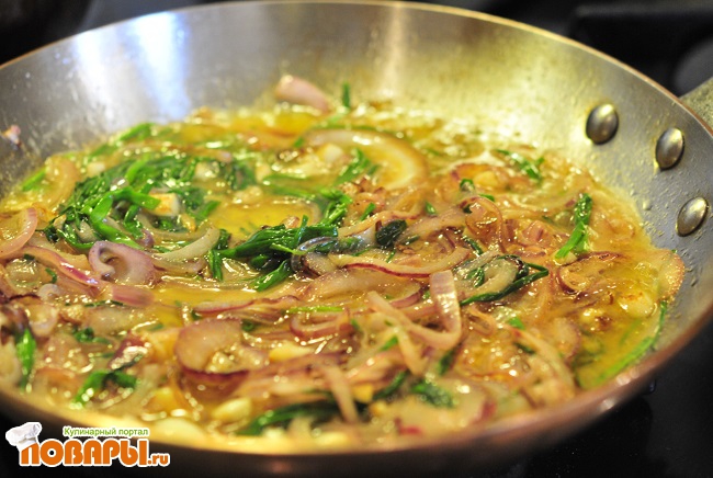 Красный лук порезать полукольцами и добавить в сковородку. Обжаривать до полного размягчения.