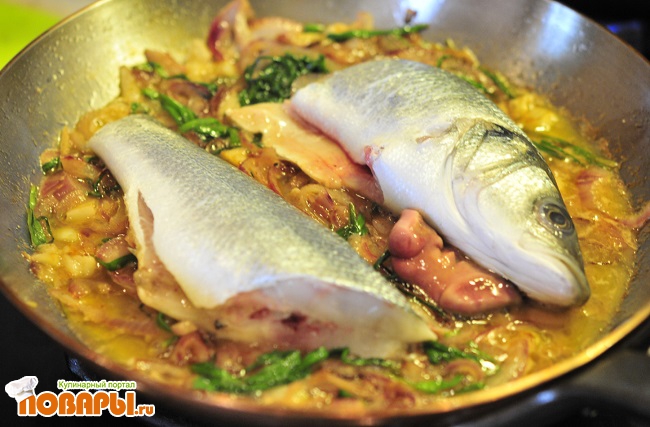 Теперь можно выкладывать рыбку и обжаривать (тушить) минут 10-15 с каждой стороны. Солим, добавляем по желанию специи.