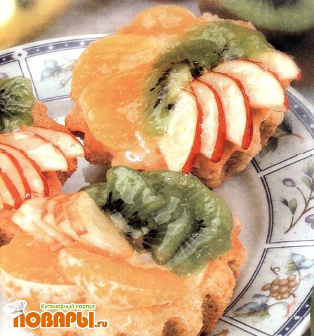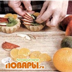 Укладывать фрукты в корзиночки, начинать с яблок. Расположить их по кругу. После этого уложить дольки мандаринов и завершить оформление кружочками киви.