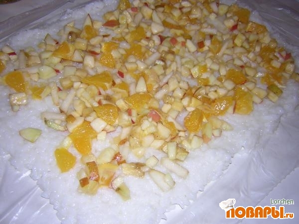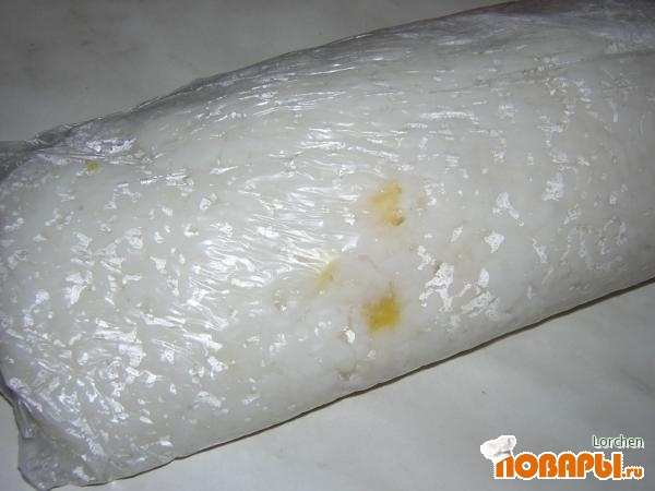 Разложить на пищевую пленку ровным слоем рис, выложить фрукты, свернуть рулетик, слегка примять.
