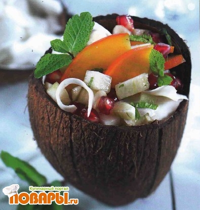 Очистите при помощи ножа для чистки овощей кокос от коричневой кожуры. Этим же ножом настрогайте мякоть. Смешайте все подготовленные фрукты с кокосовыми стружками и мятой, залейте сиропом. Подавайте салат немедленно.