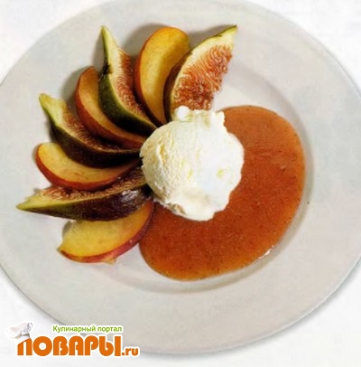 Вымойте и обсушите оставшиеся фрукты, и, не чистя, нарежьте ломтиками. Достаньте тарелки из морозилки и выложите на каждую ломтики фруктов, чередуя персики и инжир. Украсьте каждую тарелку фруктовым соусом и сверху положите по шарику мороженого. Сразу же подавайте на стол.