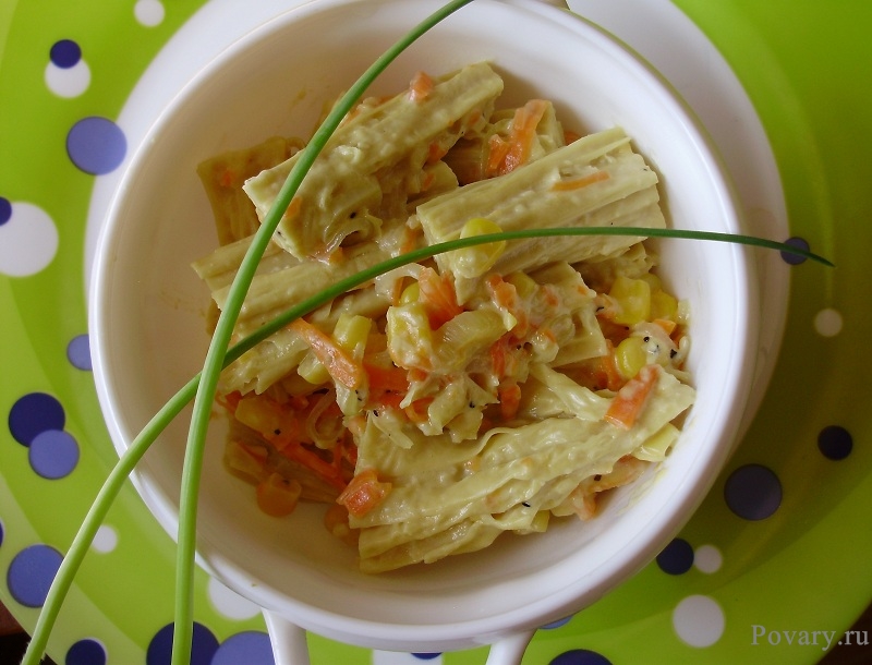 Высыпаем кукурузку, добавляем пару ложек соевого майонеза.