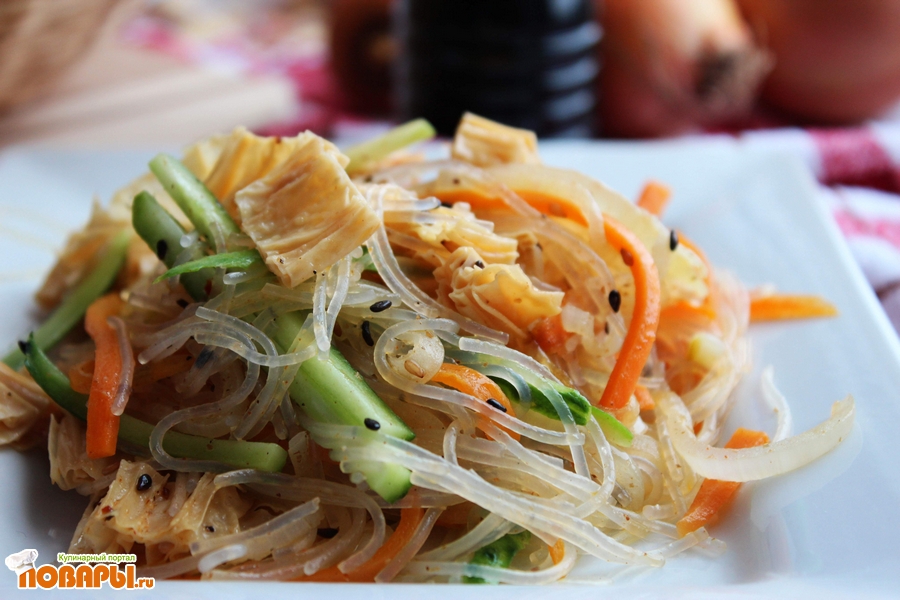 Кипятим воду, опускаем в нее фунчозу и даем ей пару минут покипеть с лапшой. Снимаем с огня, оставляем под крышкой минут на 10-15. Затем сливаем и тщательно промываем, нарезаем.