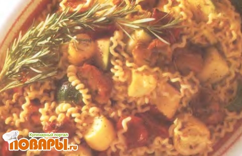 Сочные овощи прекрасно гармонируют с румяными кусочками курицы и кудрявой ленточной пастой в этом нарядном блюде. Вкус свежего розмарина подчеркивает аромат соуса из базилика и фенхеля и куриных грудок с кабачком.