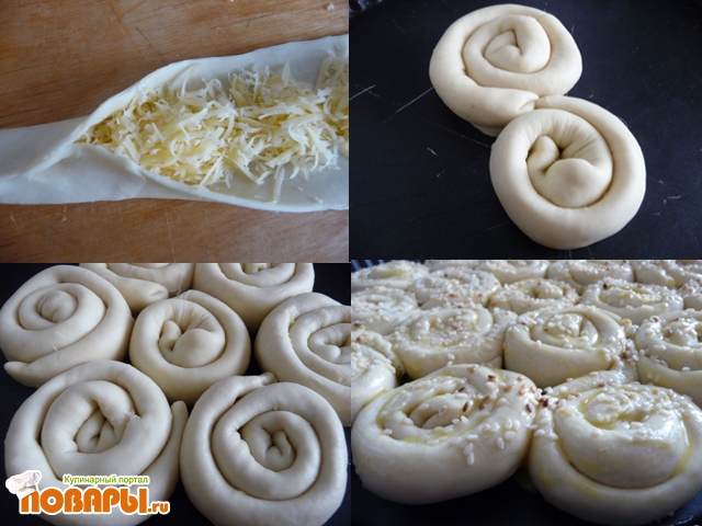 Каждую полоску раскатать, но не сильно, в одном направлении. По всей длине положить сыр, тесто защипать. Свернуть спирально. Так сделать со всеми полосками.