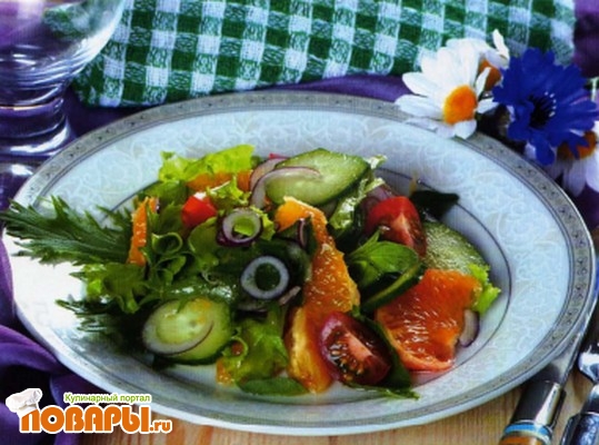 Огурцы очистить, нарезать тонкими ломтиками. Томаты черри разрезать на четвертинки. Лук нашинковать кольцами, ошпарить кипятком. Апельсины очистить от кожицы, белых пленок и косточек, мякоть нарезать ломтиками.