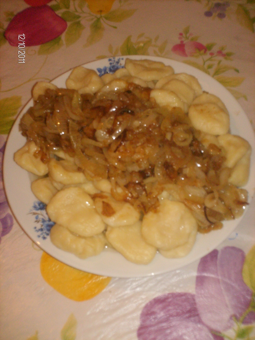 Сверху нарезаем замороженное сливочное масло, масла много не бывает, а потом горкой жареный лук. Для любителей шкварок, можно обжарить сало и также посыпать галушки сверху. Наше блюдо готово, приятного аппетита!