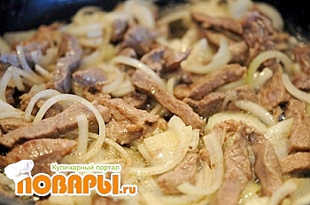 Затем к мясу кладем на обжарку лук.