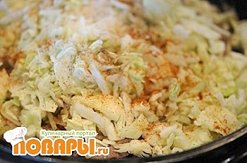 Как только лук приобрел золотой цвет и смягчился, докладываем капусту. Посыпаем ее приправами и солью. Жарим до полуготовности капусту, примерно 10 минут.