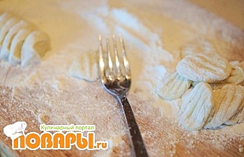 Теперь ложем на муку разрезанной стороной, придавливаем вилочкой, переворачиваем и снова придавливаем вилочкой.