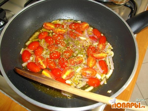 В сковороде с ложкой оливкового масла подрумянь луковицу, нарезанную полукольцами. Затем всыпь помидорки, разрезанные пополам, потуши минутки 3 на среднем огне. Теперь эту красоту посыпь орегано (за неимением можно посыпать сушеным базиликом) и присоли.