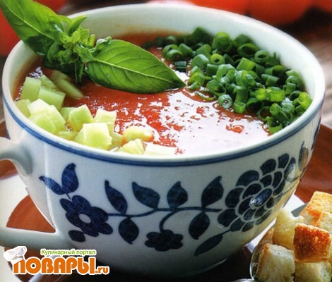 Суп разлить по суповым мискам, украсить базиликом, оставшимися кубиками огурца и мелко нарезанным зеленым луком.