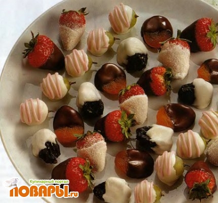 Поломайте во вторую кастрюльку шоколад, растопите его на водяной бане, добавив 1 ст. л. воды. Когда шоколад станет жидким, обмакивайте некоторые фрукты в шоколад и оставляйте застывать на пекарской бумаге.