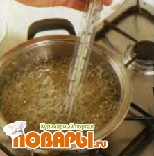 Доведите до кипения и проконтролируйте температуру: она должна составлять 115°С. Если у вас нет термометра, возьмите каплю сиропа, слегка остудите, а затем покрутите между пальцами - должен образоваться маленький шарик.