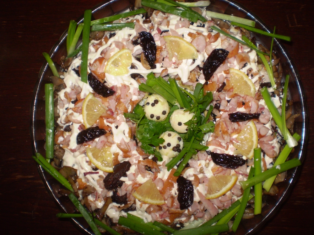 Далее тертый твердый сыр, политый соком лимона и посыпанный тертой на мелкой терке цедрой лимона. Куриное копченое мясо режем мелкими кубиками (оставить 3 ст. ложки*), смешиваем с резаным черносливом, эту смесь выкладываем следующим слоем, обильно поливаем соком лимона и делаем майонезную сеточку.