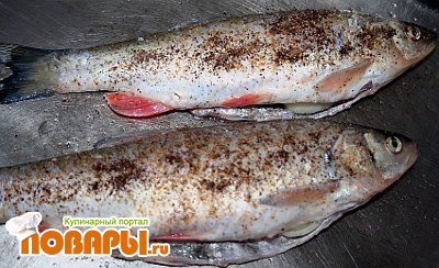 Посыпаем рыбу сверху и внутри молотым черным перцем и приправой для рыбы.