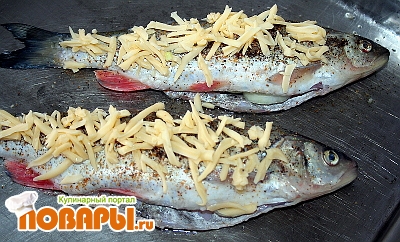 Сыр натираем на крупной терке и присыпаем рыбу сверху.