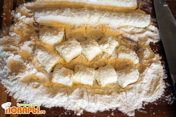 Другой вариант приготовления гомбовцов может быть проще или сложнее, кому как- просто обволакивать по не большому количеству теста в муке, формируя шарики. Но мне удобней колбаской. Не забывайте так же, что гомбовцы при варке увеличатся в размере.